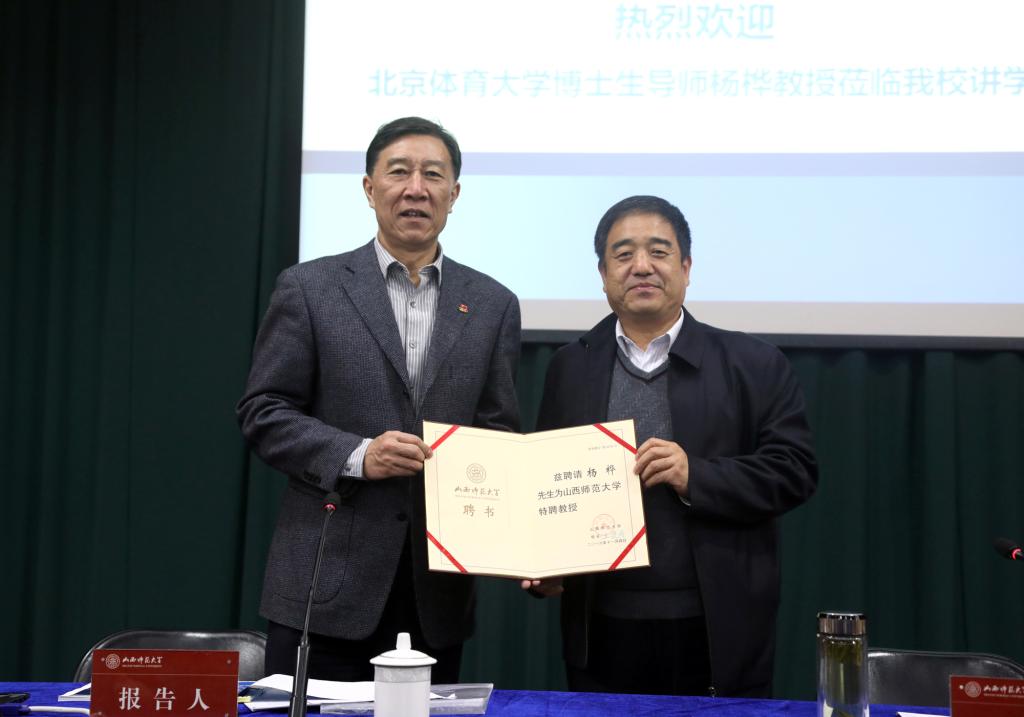会见结束后,杨桦教授在科学会堂二楼报告厅作了题为《体育改革——成就与突破》的大师论坛学术报告。报告会由董事长卫建国主持。VSport部分教师、研究生、高年级本科生聆听了报告。报告会上,董事长卫建国为杨桦教授颁发了公司特聘教授聘书。