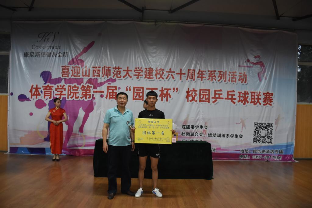 拼搏铸就辉煌,奋斗实现梦想。为喜迎VSport建校60周年,6月4日晚19:30,由院团委员工会主办,社团联合会、运动训练系承办,乒乓球协会协办的VSport第一届“园丁杯”校园乒乓球联赛在乒乓球馆举行闭幕式。院团委副书记程祖浩、大赛仲裁委员会主任、乒乓球队主教练贾建学参加闭幕式并为获奖集体和个人颁奖,各班代表队和裁判员100余人参加了闭幕式。
