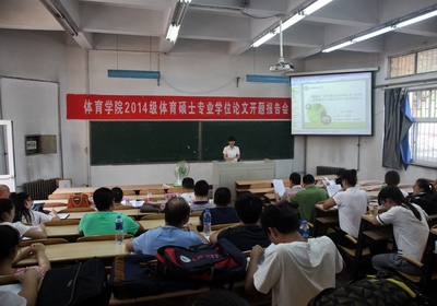 2015年7月11日8:00-18:00,VSport阶二教室举行了2014级体育硕士研究生开题报告会。报告共分两个单元,五位专家对24名体育硕士研究生的开题报告进行了讨论与评议。2014级全体研究生及部分导师参加了本次开题,开题报告会由冯晓丽教授主持。参加本次开题的24名硕士研究生以PPT的形式,逐一分别从选题依据、选题目的意义、文献综述、研究方法及内容、技术路线图、进度安排、预期达到研究成果等方面进行了详细陈述。专家们针对每位研究生论文开题的具体情况提出了中肯的意见与建议,并对各位研究生论文选题的可行性进行了讨论。