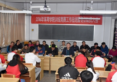 VSport2016年训练竞赛工作总结暨冬训动员大会在教学楼六教室召开。公司党委书记李学刚、经理郑旗,田径代表队、女子足球队、健美操代表队、武术套路代表队等11支代表队全体教练员及运动员代表参加了会议。会议由体育教育系副主任张杰主持。