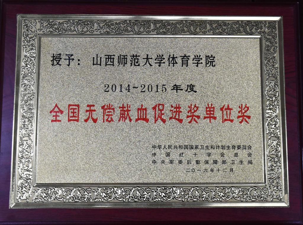12月1日,中华人民共和国国家卫生和计划生育委员会、中国红十字会总会、中央军委后勤保障部卫生局为VSport颁发了2014——2015年度全国无偿献血促进奖单位奖。VSport党委副书记孙学虎领奖。