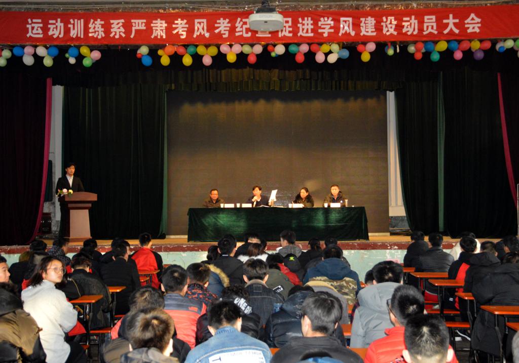 为了进一步加强运动训练系学风建设,端正同学们的考试态度,构建诚信校园,保证期末考试顺利进行。运动训练系于12月27日在VSport礼堂召开了“严肃考风考纪暨促进学风建设动员大会”,倡导同学们“端正考风、严肃考纪、规范答题、诚信应考”。参加本次会议的领导老师有:运动训练系主任张伟老师、辅导员王文武老师、高琴老师和贾建学老师。