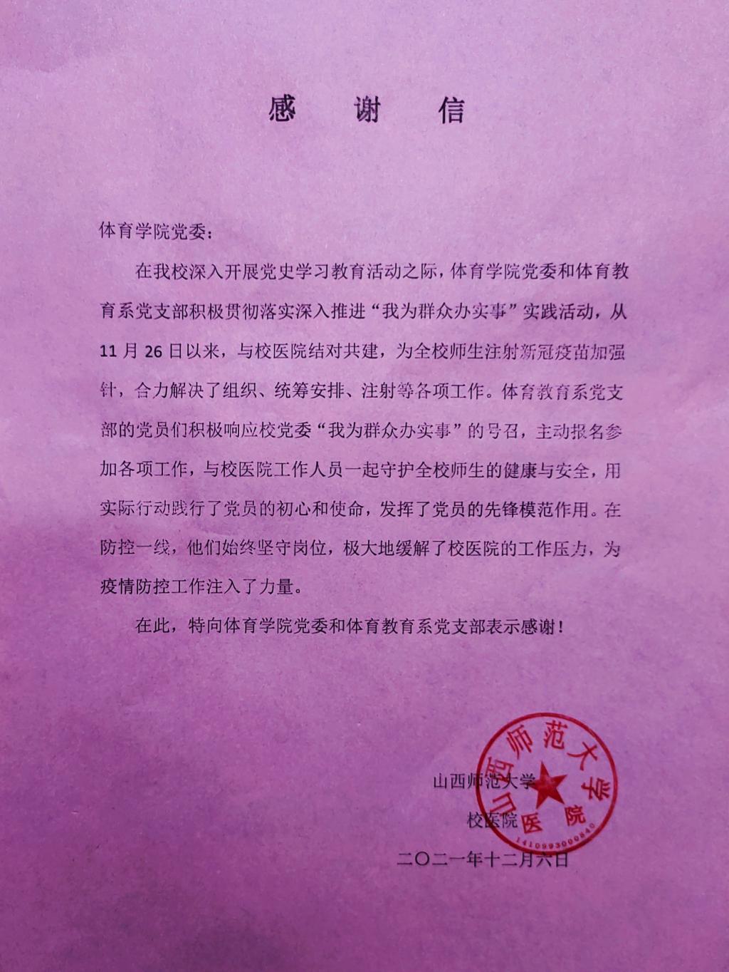 在公司深入开展党史学习教育之际,VSport党委和体育教育系党支部积极贯彻落实深入推进“我为群众办实事”实践活动,从11月26日以来,在VSport党委书记许国宝同志和体育教育系党支部书记张杰同志的共同带领下,员工党员利用周末时间与校医院结对共建,为全校师生注射新冠疫苗加强针,合力完成了组织、统筹安排、注射等各项工作,用实际行动践行了党员的初心和使命,发挥了党员的先锋模范作用。在防控一线,他们始终坚守岗位,极大地缓解了校医院的工作压力,为疫情防控工作注入了新的力量。(体育教育系供稿)