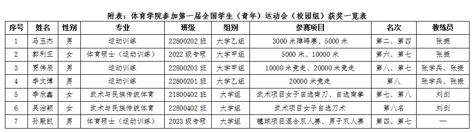 公司14人入选学青会山西代表团(校园组),其中田径队教练员2人,运动员5人;武术队领队1人,教练员1人,运动员4人;毽球运动员1人。公司参赛健儿在教练员张振、张学兵、刘剑的精心训练指导下,不畏强手、顽强拼搏,取得了优异的成绩(见附表)。