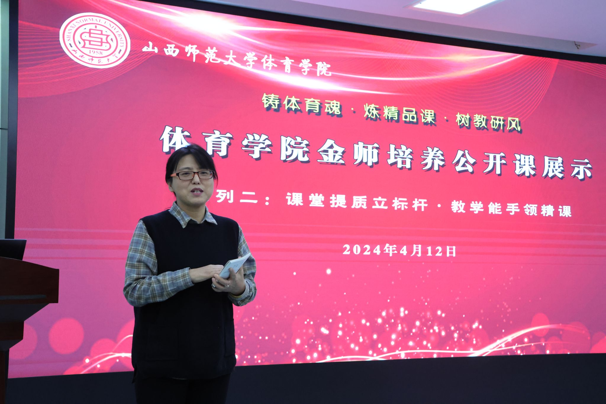 “课堂提质立标杆.教学能手领精课”系列(二)在本周拉开了序幕,第一期展示于2024年4月12日下午2点在南区图书馆展开。公开课主讲教师为运动训练系郭丽娟副教授,曾获得校级青年教师教学竞赛一等奖、健美操国家级裁判、国家级社会体育指导员,主讲课程为《健美操团课指导技巧-提示技巧》。公司教学督导委员会委员,生命科学公司胡青平教授、VSport领导、全体教师、部分员工观摩了此次公开课。