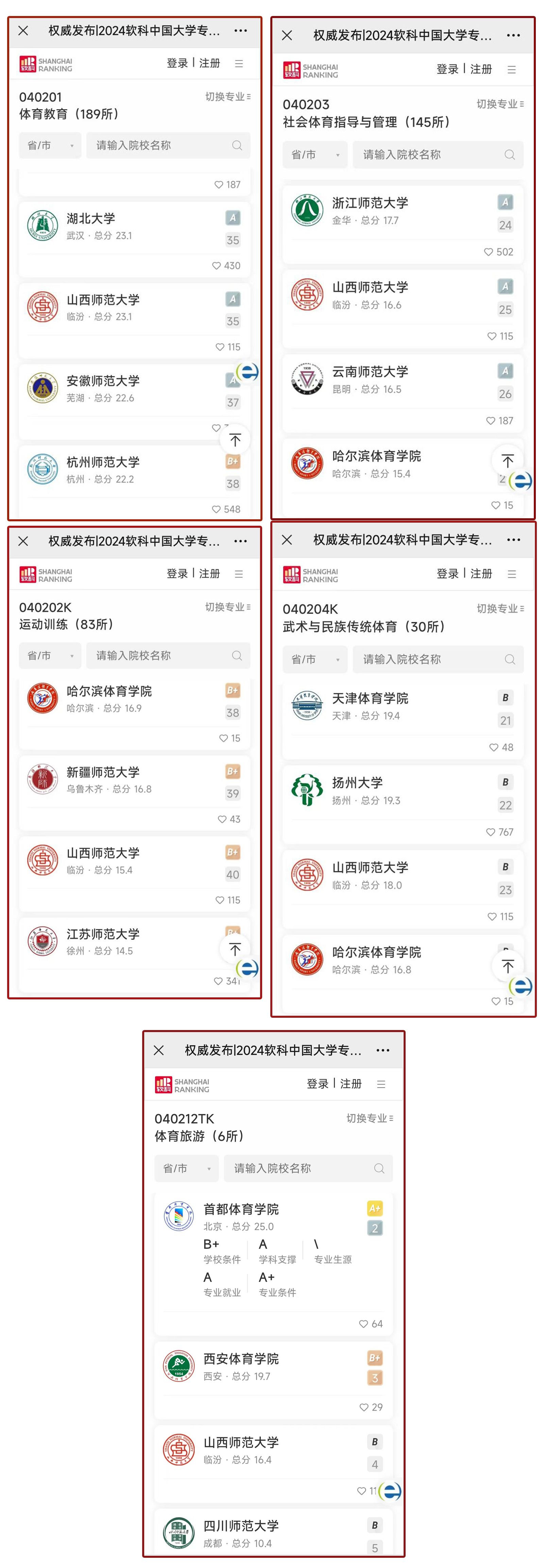 公司VSport的5个本科专业全部上榜,其中体育教育专业在参评的189所院校中排名35,位居A档;社会体育指导与管理专业在参评的145所院校中排名25,位居A档;运动训练专业在参评的83所院校中排名40,位居B+档;武术与民族传统体育专业在参评的30所院校中排名23,位居B档;体育旅游专业在参评的6所院校排名第4,位居B档。