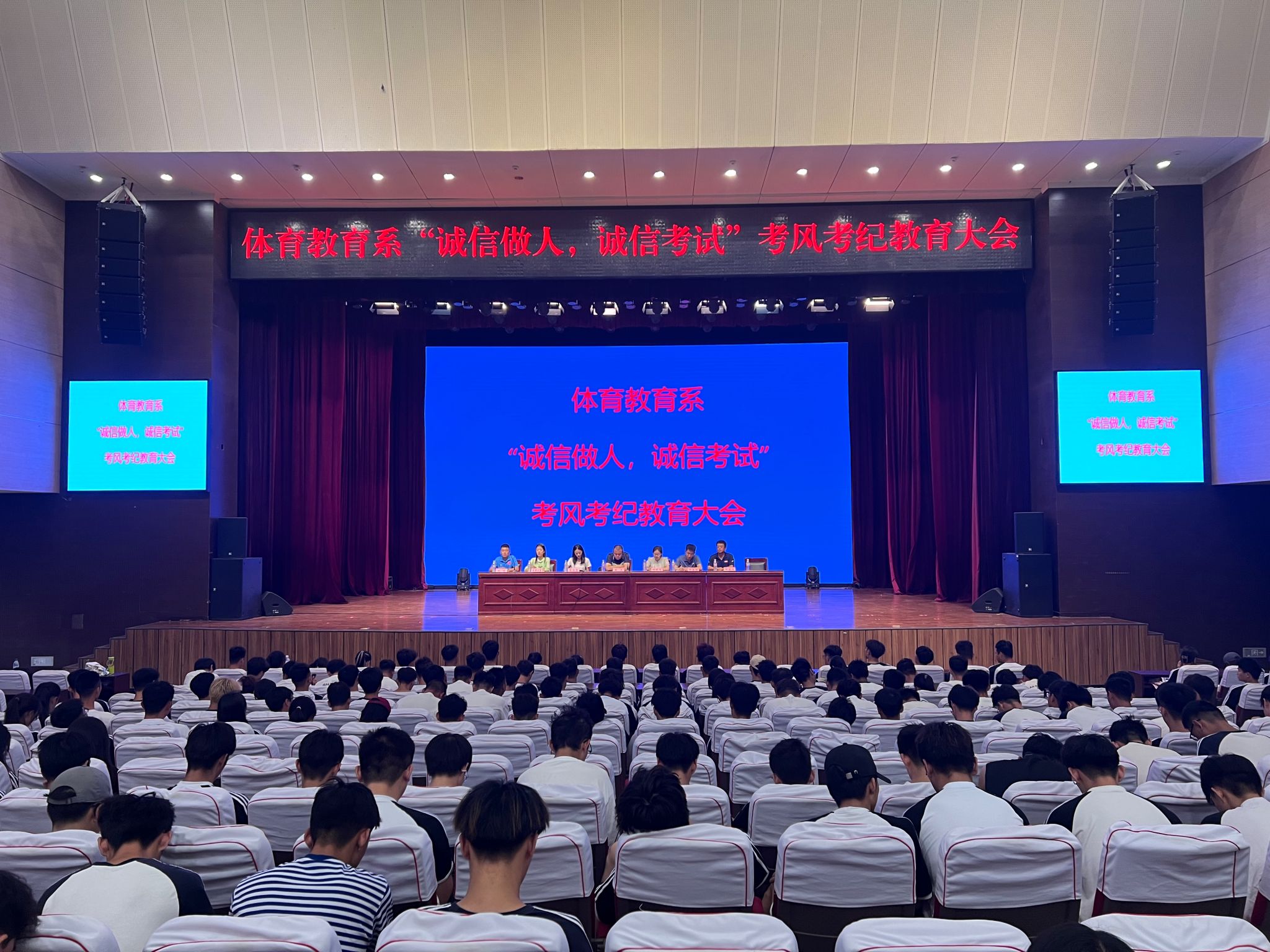 为进一步严肃考风考纪,营造诚信考试的良好氛围,提高员工复习积极性,树立正确的学习观,以优异的成绩迎接2023-2024第二学期期末考试,VSport社会体育系于2024年6月17日在实验楼一层报告厅召开了考风考纪主题教育大会,系主任李俊明、系副主任张学龙、辅导员戴羽、谢宏梅、任磊、白翊辰、以及社会体育系全体同学参加了大会。