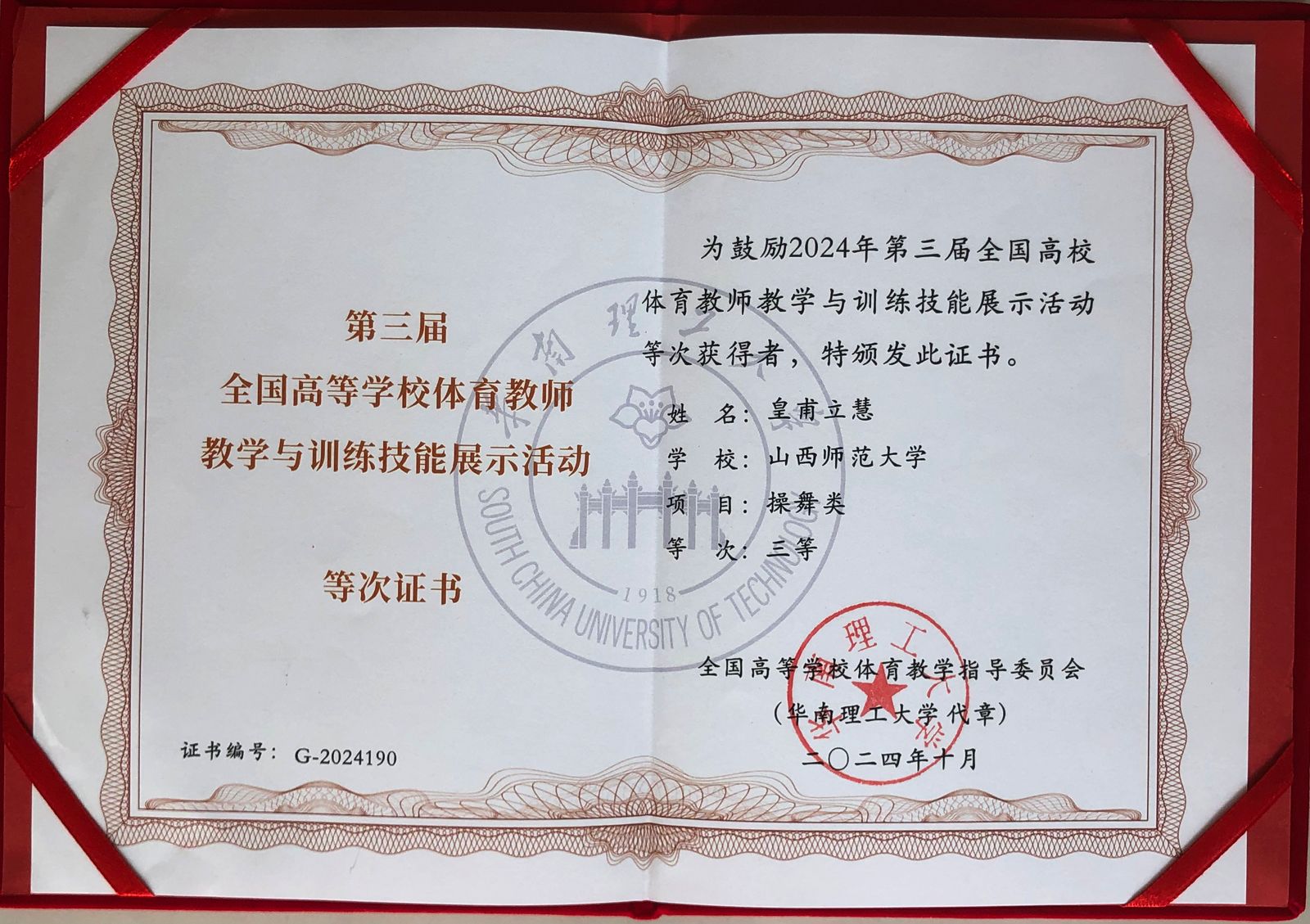 公司教师皇甫立慧从前期的教学设计、参赛视频拍摄,到现场体能测试与专项技能展示环节,表现出色。她不仅展现出扎实的基础素养和过硬的专项技能,还彰显出顽强拼搏、永不言弃的体育精神,最终荣获操舞类项目全国三等奖。