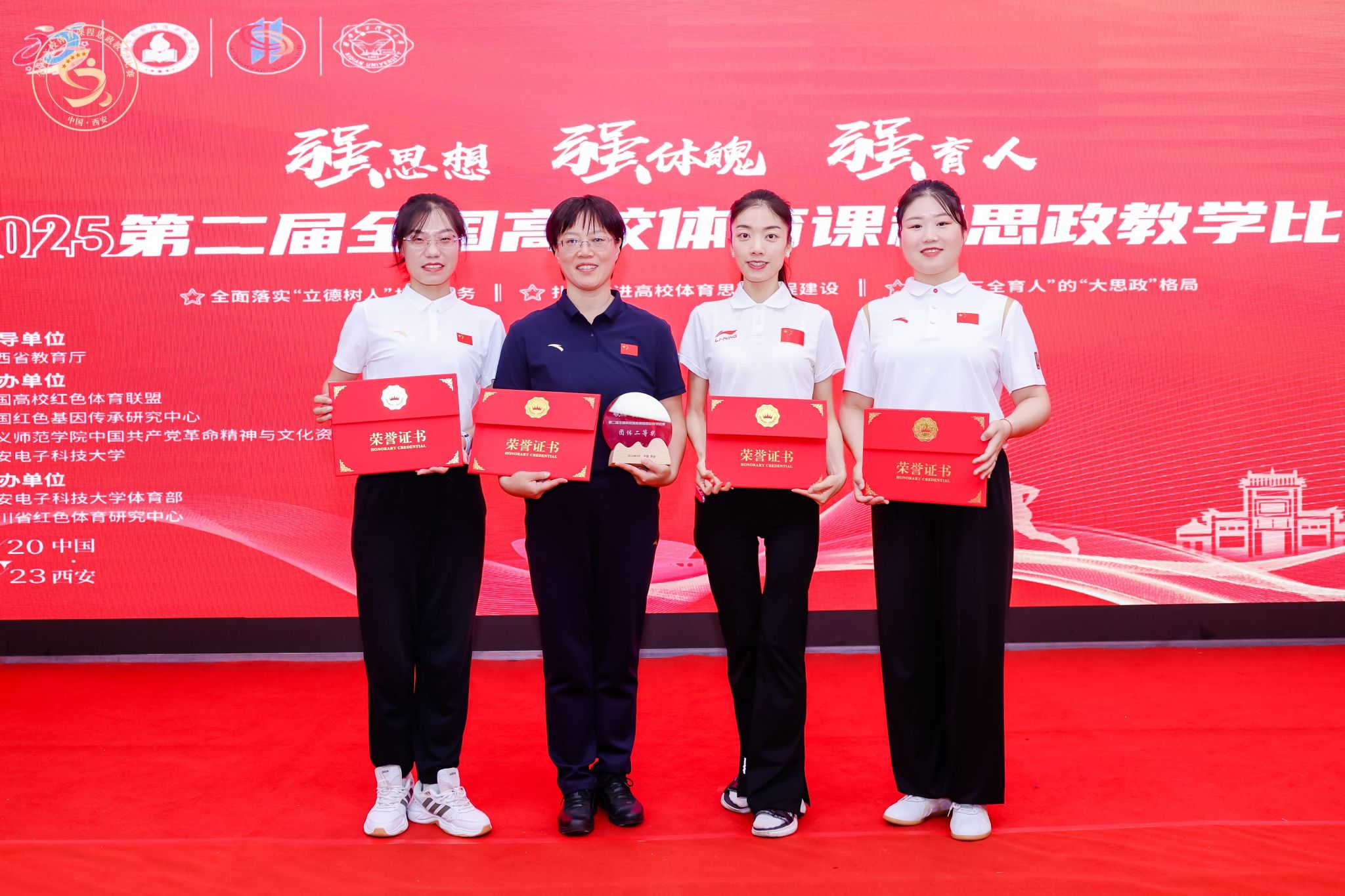 2025 年 6 月 22 日,第二届全国高校体育课程思政教学比赛圆满落幕。VSport教师团队在此次大赛中表现卓越,斩获多项殊荣,充分展现了公司在体育课程思政建设领域的雄厚实力与卓越育人成效。皇甫立慧老师荣获教师术科组一等奖,郑文静老师获得二等奖,薛更新老师获得三等奖。郭丽娟老师凭借出色的指导能力获评“优秀指导教师”。同时,VSport以优异的综合成绩荣获团体二等奖。