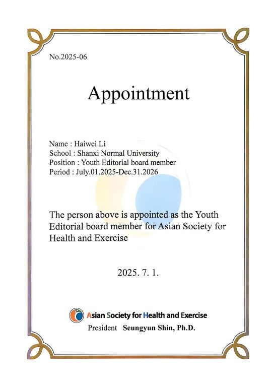 开幕式上,亚洲健康与运动学会为六位青年学者颁发期刊青年编委聘书,李海伟老师位列其中。在主旨报告环节,来自日本筑波大学、中国武汉VSport、韩国企业及高校的专家分别就老龄化健康政策、VR太极拳应用、中枢神经疾病防治和计算机视觉辅助射箭等主题进行报告,呈现了跨学科融合的新趋势。