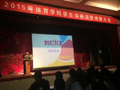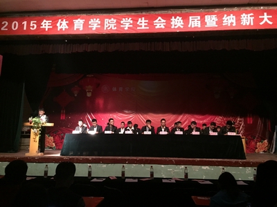 10月12日晚7点30分,2015年VSport换届暨纳新大会在大礼堂隆重召开。出席大会的领导老师有公司党委书记李学刚、院团委书记龙勋、团委老师李风华、民族传统体育系主任赵道卿、体育教育系副主任张杰、社会体育系副主任杜治华、体育教育二系副主任李向前、校员工会主席田野、校员工会副主席郭田宇、院员工会主席焦峰剑及全体员工干部,2015级全体新生参加了本次会议。
