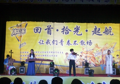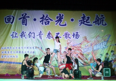 夜幕衬托下的大银幕上一段段大四员工的视频饱含对毕业前离别的感伤,对未来的期望,对恩师的感谢,随之和着大四学长学姐一支优美的华尔兹舞蹈,晚会正式拉开帷幕。一段活力四射的街舞就将晚会火热的气氛立刻提升起来;一段幽默诙谐的相声,更是让观众嬉笑不已;中西结合的乐器演奏让大家看到了体育人不同寻常的一面;随后一支动感十足的雷人舞及劲爆的架子鼓表演给我们以视觉的享受;最后大四学姐一首《爱的代价》让我们回味无穷,表达了她对毕业的无限感伤,晚会在全体毕业生的一首《不说再见》大合唱中慢慢拉下帷幕,表达了他们对校园生活的眷恋、不舍以及对毕业不散场的美好祝愿。