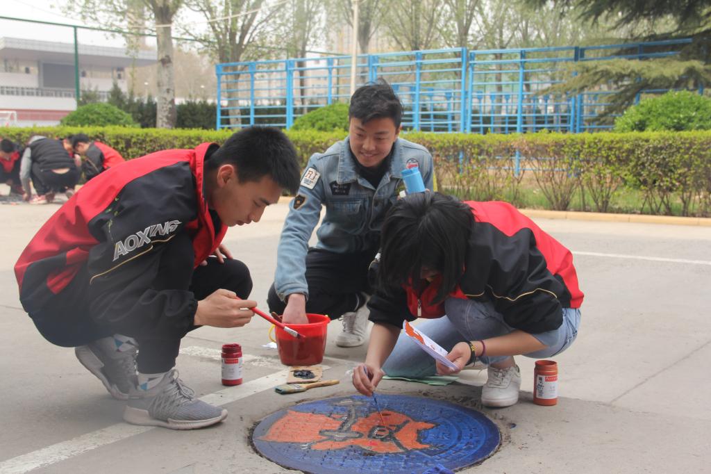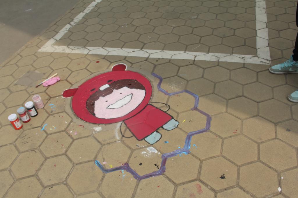 在历时四天的活动中,同学们个个兴致勃勃,自备彩绘工具,几人一组,分工合作,默切配合,发挥想象,大胆构思,为校园内的井盖绘制了一幅幅内容积极向上、画面绚丽醒目的图案。在这次活动中绘制的图案类型多样,有海绵宝宝、小黄人、哆啦A梦等古灵精怪的卡通人物,还有笑脸,糖果等可爱的图标。经过同学们的巧手绘制,一个个单调黑色的铁井盖变成了色彩绚丽的图画,成为校园一道亮丽的风景线,吸引不少往来人群纷纷驻足观看,受到了大家的赞赏。