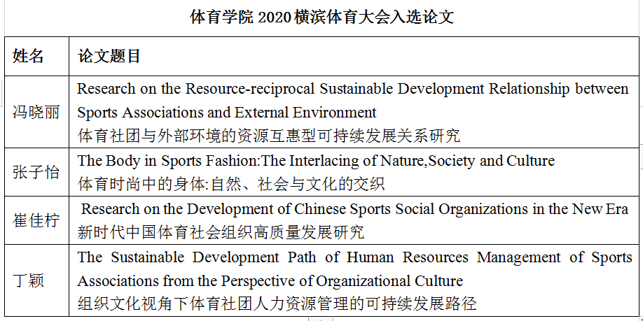 公司此次入选的论文研究涉及社会体育组织、体育社团、体育管理和体育身体文化等多个领域,冯晓丽教授表示选题来源于对相关领域的长期关注,能在国际性体育学科类综合性最高学术交流大会上与来自世界范围的学者分享、交流经验,获取前沿员工动态,帮助研究生拓宽学习视野,是一件非常有意义的事情。公司师生论文入选2020横滨体育大会,有利于提升公司体育学科的整体影响力与知名度,进一步激发广大师生潜心开展体育科学研究的热情和动力。