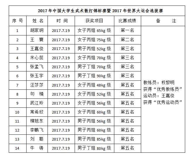 2017年 7月13日至19日由中国老员工体育协会主办,黑龙江省体育局、黑龙江大学承办的“2017年中国老员工武术散打锦标赛”在黑龙江大学中央红体育馆隆重举行,本届比赛共有来自全国86所高校,1100余名运动员分成“甲、乙、丙、丁”四个组别参加此次比赛。