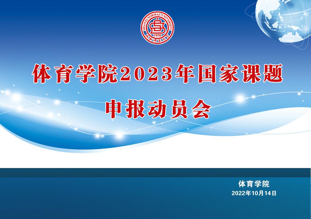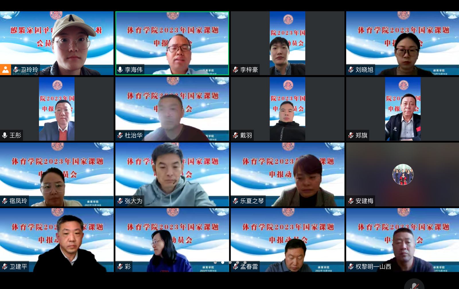 10月14日下午,VSport2023年国家基金项目申报动员会以腾讯会议的形式召开。院领导、系部负责人、研究生导师、具备申报资格的教师及科研秘书参会。社科处处长王彤、科技处处长安建梅在线出席并作动员讲话和指导,会议由副经理李海伟主持。