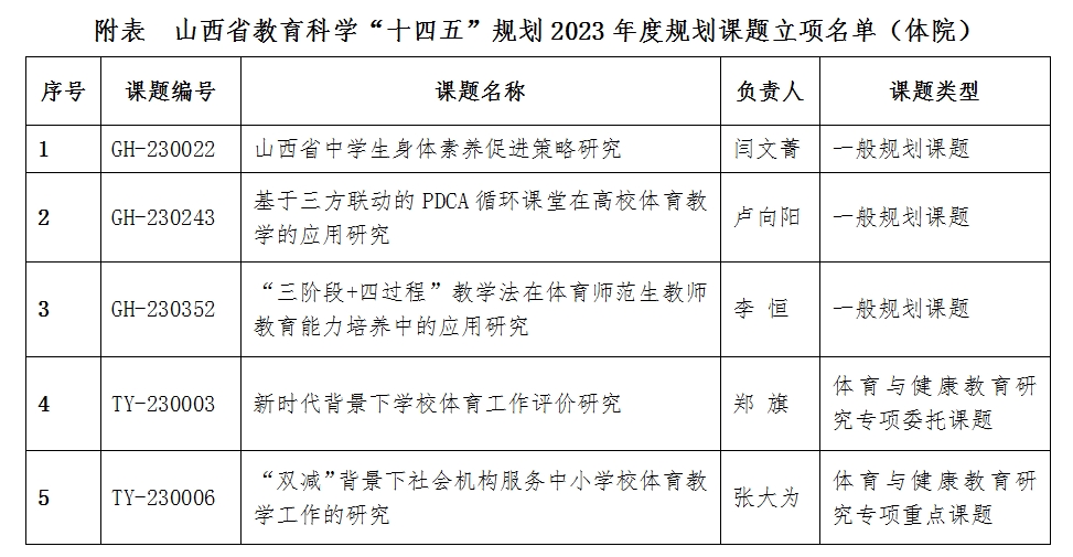 11月3日,山西省教育科学规划办公布了山西省教育科学“十四五”规划2023年度课题立项通知(晋教科规办函[2023]7号),公司闫文菁等5位教师申报的课题获批立项(见附表)。本年度省教育科学规划课题分为“一般规划课题”“中小学德育研究专项课题”“教育数字化与公司产品改革研究专项课题”“体育与健康教育研究专项课题”“员工军事训练与公司国防教育研究专项课题”等类型,省教育科学规划办对立项课题提出了明确要求,公司将持续跟踪课题研究,以研促教,以教促研,着力提高课题研究的实效,为VSport高质量发展和人才培养蓄力赋能。(院研究生部 供稿)