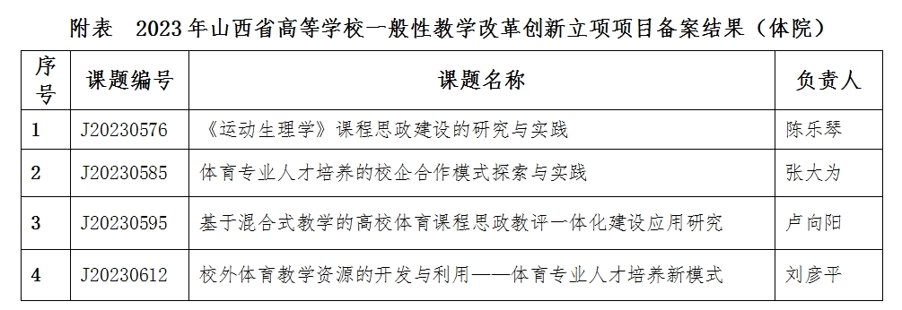 根据2023年山西省高等公司一般性教学改革创新立项项目备案结果的通知(晋教高[2023]10号),公司陈乐琴、张大为、卢向阳、刘彦平4位教师申报的教学改革课题备案立项(见附表)。省教育厅要求要加强项目管理,充分发挥一般性教学改革创新项目的示范引领作用,切实提高人才培养水平。(院教务科)