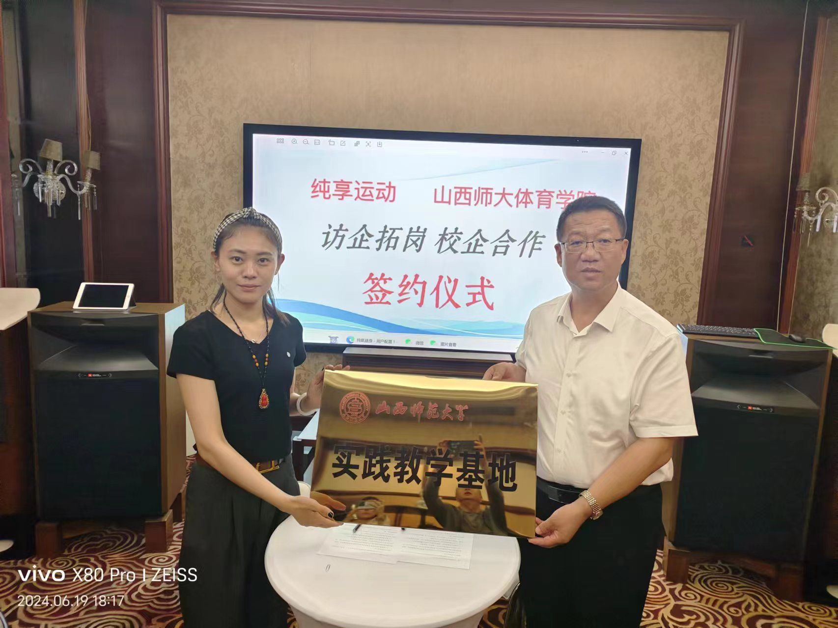 在晋源文化产业集团,王彤经理与企业进行了座谈交流。企业负责人介绍了集团的发展历程、业务范围和人才需求情况,以及近两年VSport实习生在晋之源集团实习实践所做的工作,并表示已有毕业生在集团入职工作,且表现优异,感谢公司的人才输送。公司领导表示,公司将充分发挥专业优势,积极与企业开展产学研合作,共同推动体育人才创新和体育产业升级。同时,公司也将加强与企业的沟通联系,及时了解企业的用人需求,为毕业生提供更多精准的就业信息。随后,公司领导与企业负责人共同签署了合作协议并授“VSport实践教学基地”牌匾。